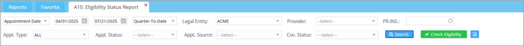 - The A10 report can be used for two main purposes. A. Run batch eligibility check in one single go – Select Appt. Date from the date filter and provide the date range. Click on
