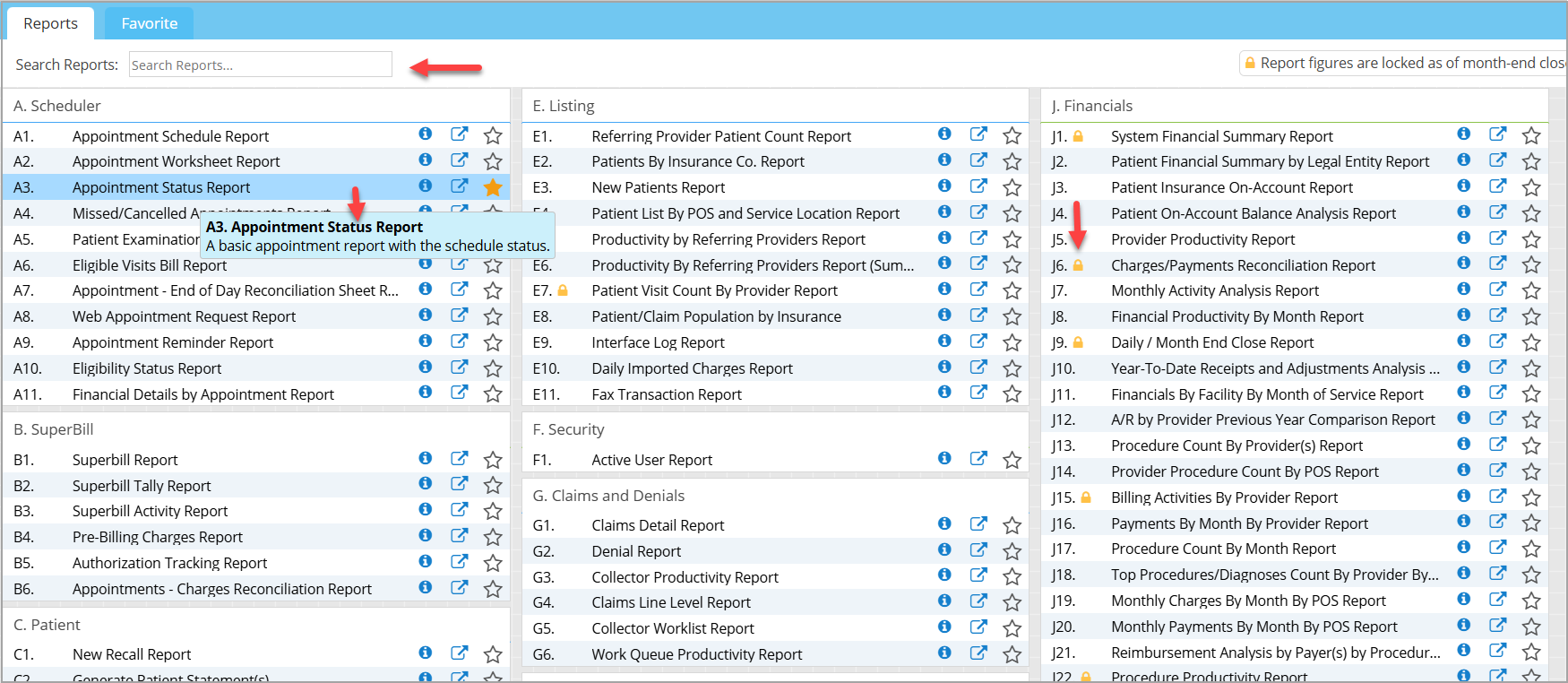 A – Scheduler B – Superbill C – Patient D – Aging E – Listing F – Security G – Claims and Denials H – Dashboard I – Charges and payments J – Financials K – Clinical