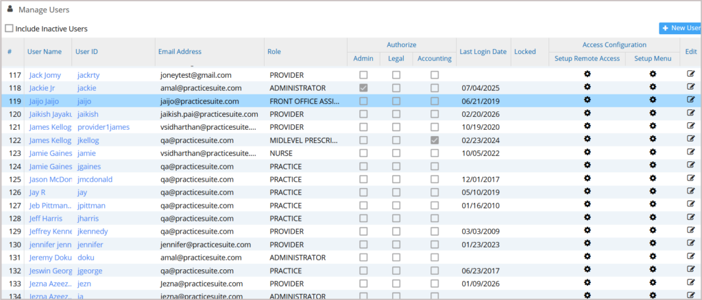 1. Click on the Security module and select User. The list of users, along with their roles, access permissions, etc., is listed as shown in Image 3. On the top left, click on the checkbox “Include inactive users.” This shows all the active and inactive users of the system. Inactive users will be highlighted in red.