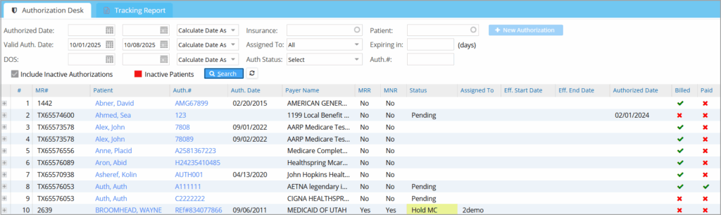 Note: Authorizations of inactive patients are displayed in Red.