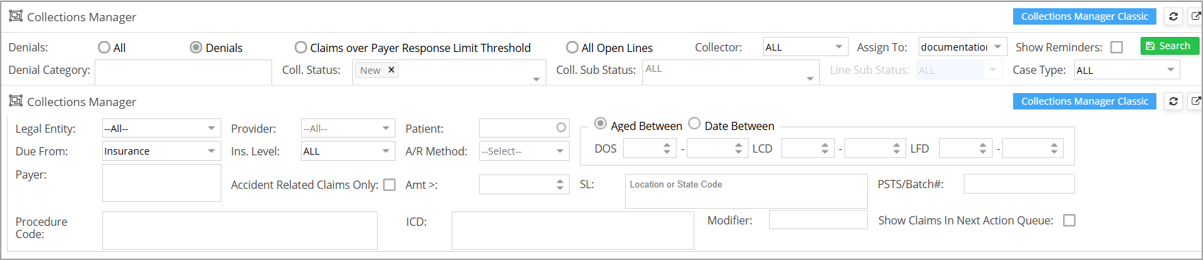 Collection Manager has various search fields that help to filter the claims based on the requirements.