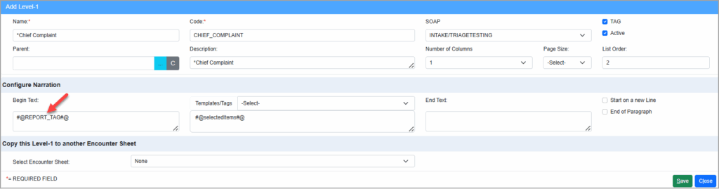 To populate a patient’s chart information in the custom visit summary report, the required Level 1 should have the tag #@REPORT_TAG#@ in the Begin Text field.