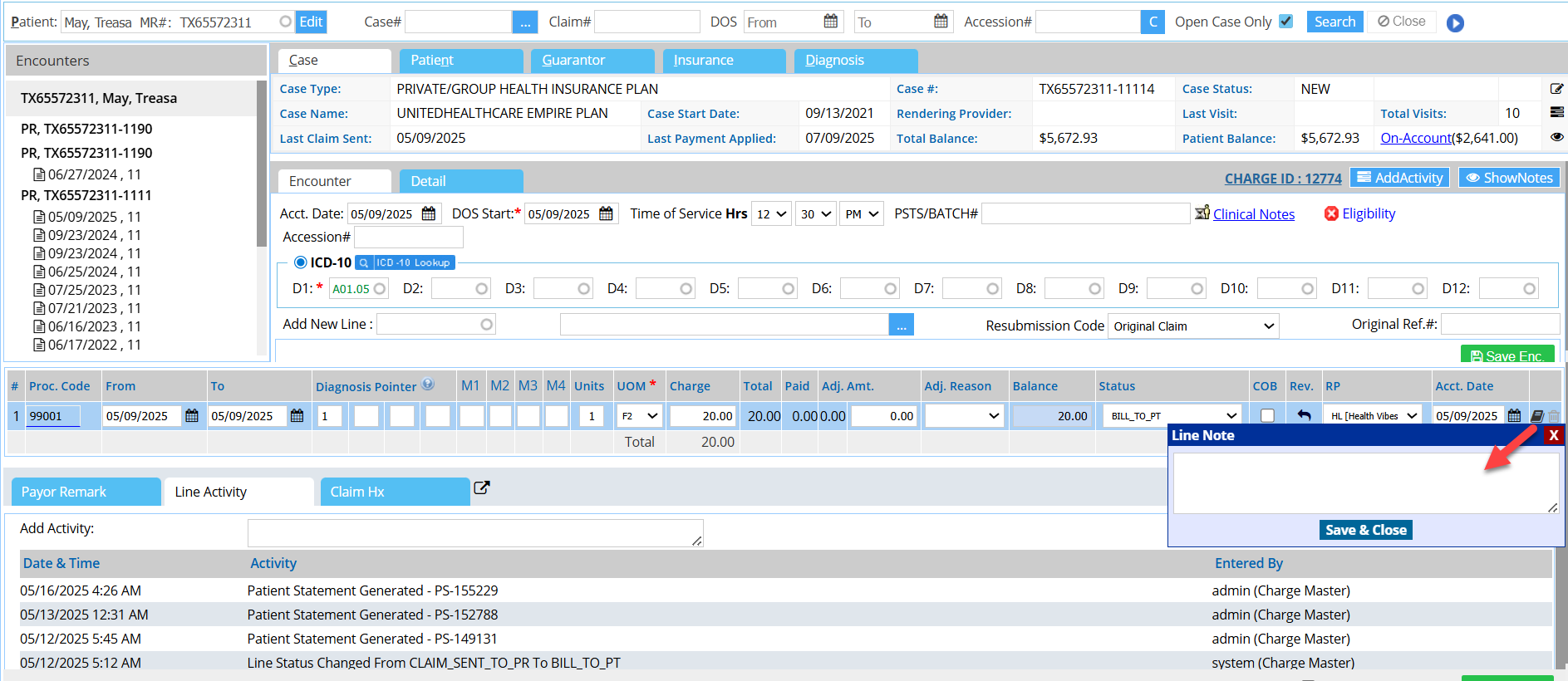To enter the anesthesia time of a procedure, click on the line note icon