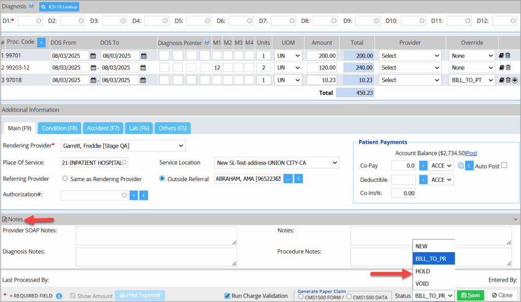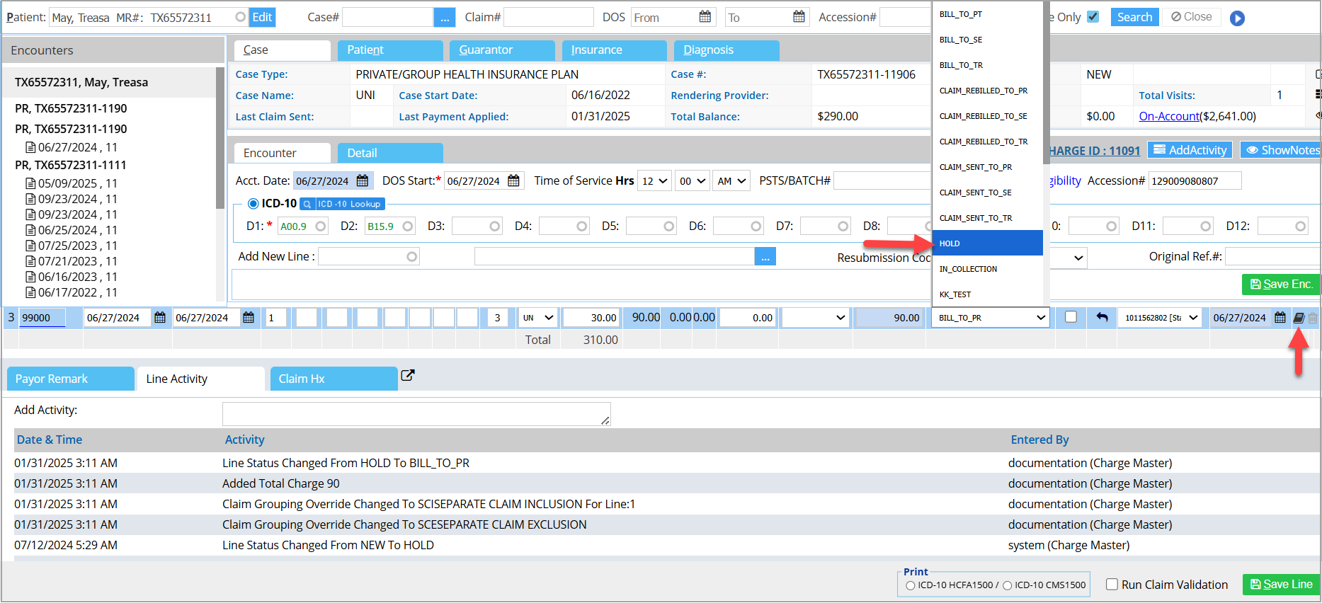 3. On the encounter line, select the Status as HOLD (see Image 4). To add any notes, click on