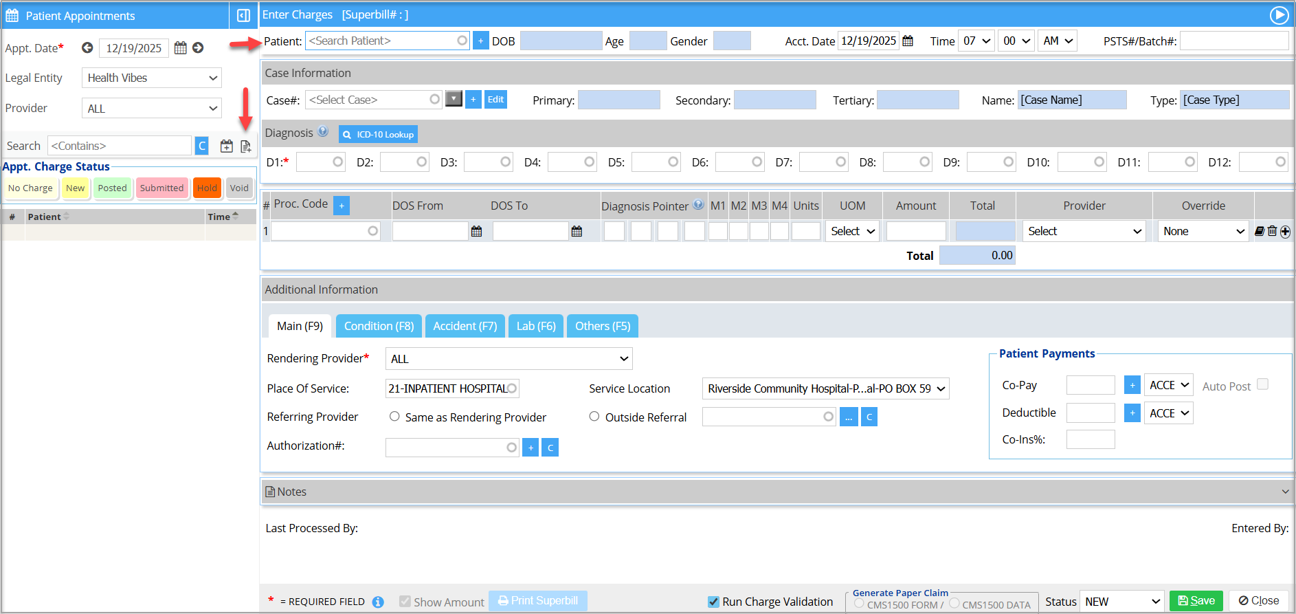 Either click on the Enter Charge icon (highlighted in the image) in the appointment section or select a patient from the Patient field and start entering the details. Click Save after entering all the required information.