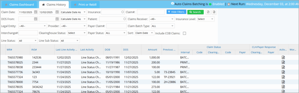 4. Choose the search parameters such as Claim Date Range, DOS Range, Claim Batch Type, Legal Entity, Insurance Level, Claims Receiver, etc as you wish to filter the claims.
