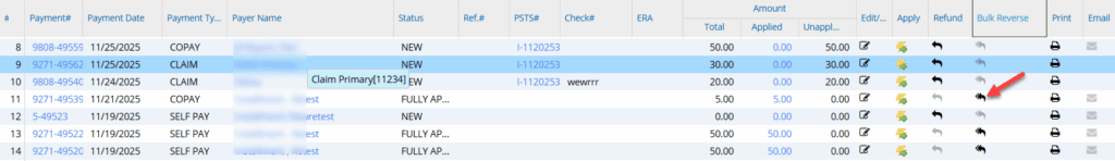 For bulk reversal, go to Payments from the main menu and choose Enter/ Edit Payments. Lookup the payment entry and use the Bulk Reverse button. Click on the Bulk Reverse option after entering the details.