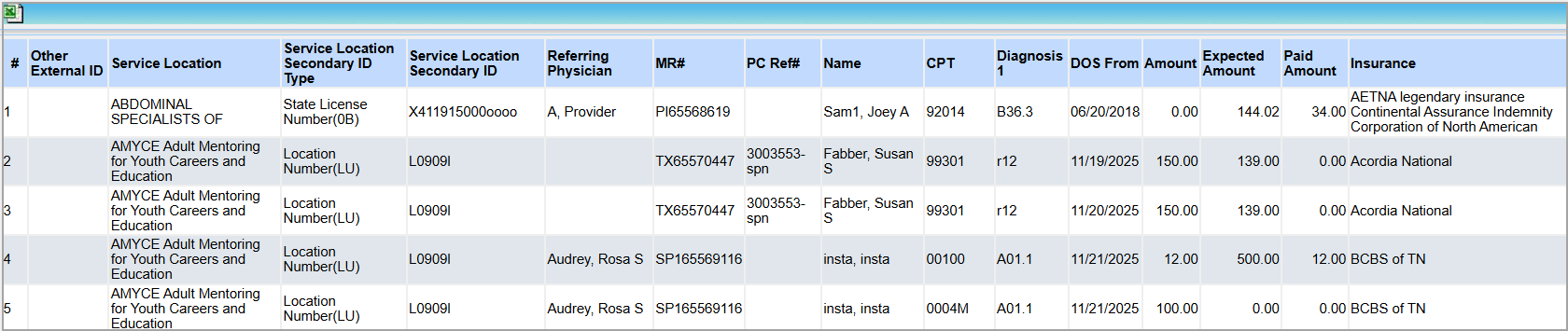 I23 is a line-level report of billed, paid, and expected amounts by service location with referring, patient, and insurance info.