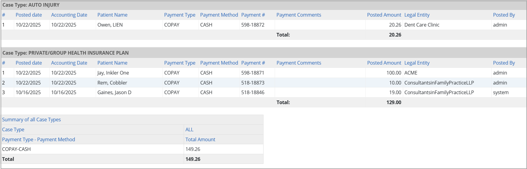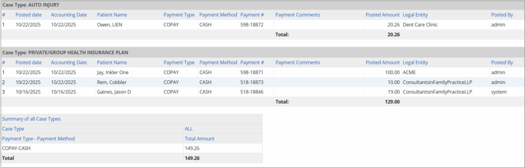 1. This report provides insight into patient payment postings by case type, helping track payment distribution, posting accuracy, and trends across different payment types and methods.
