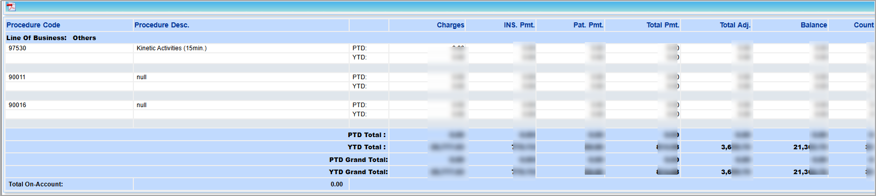 The J22 report summarizes procedure-wise totals for billed amounts, payments (separately for insurance and patient), adjustments, outstanding balances, and encounter counts for both the selected period and year-to-date. The report can be generated by line of business or payer type, with an optional breakdown by provider.