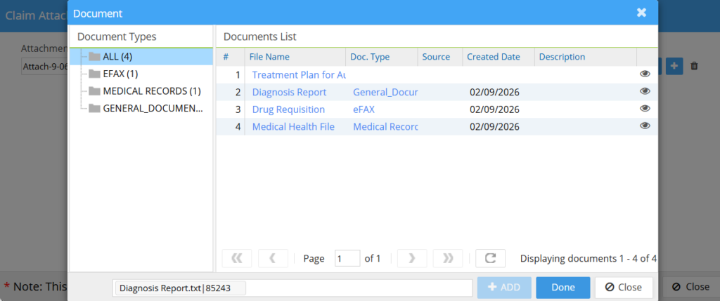 2. Patient’s Document Manager opens up, from which the user can add documents. Add the required documents and finally click Done.