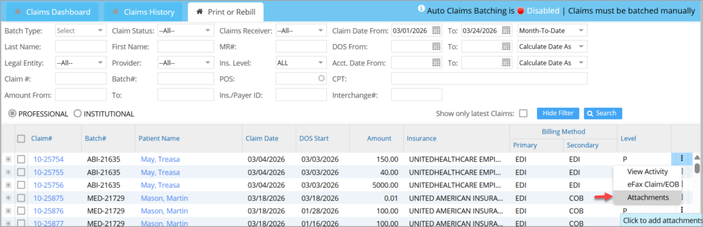 2. Print/Rebill tab in Claims Workbench