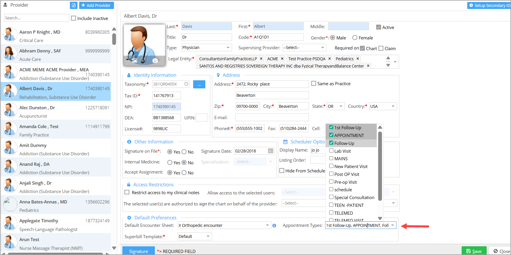 The Appointment Types dropdown is multi-select. Users can assign one or more appointment types to each provider.