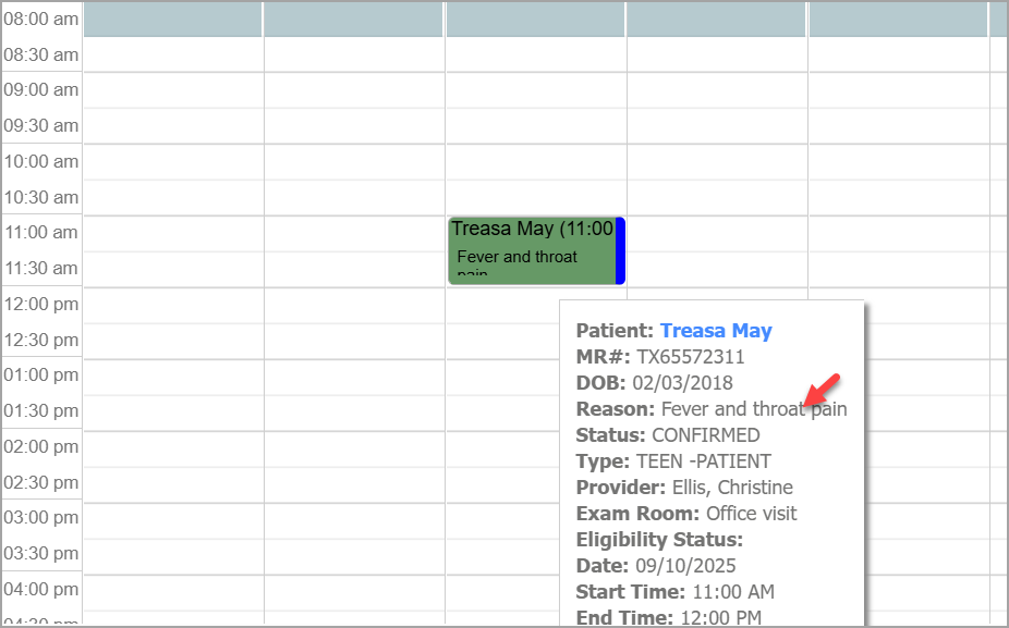 3. Patient name has a tooltip that displays the full name of the patient along with the time allotted.