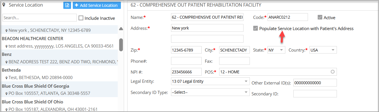8. The Service Location Master has a new configuration: Populate Service Location with Patient’s Address. Using this field, practices can now designate the patient’s home address to populate the location address on professional claims (both paper and electronic), regardless of the place of service (PoS) code. When enabled, this option overrides the default place-of-service address logic and uses the patient’s address in the service location segment.