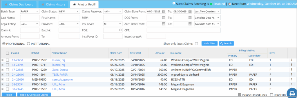3. Alternately, you can go to the Print/Re-Bill tab to view New Paper claims. Select the Batch Type as PAPER, Claim Status as NEW. Click on Claim Date From and To dates. You can also search for claims using other search options like DOS or Accounting Date. If you wish to view claims for a particular patient, enter the patient name. Click on Search to view claims with the selected parameters. A sample result is shown in Image 2.